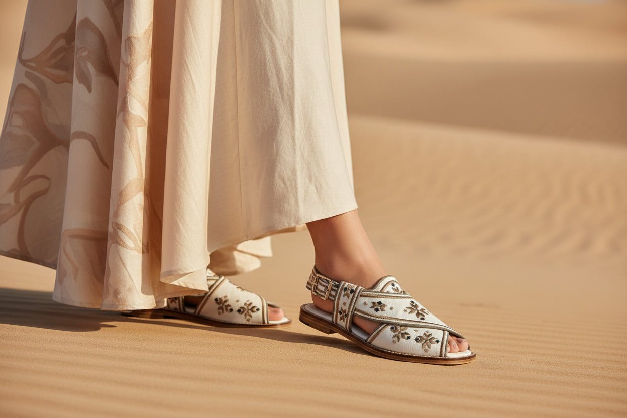 بما أن كل زوج من الصنادل مصنوع يدويًا بشكل فردي، فقد توجد اختلافات طفيفة في التشطيب والمظهر. لا نعتبرها عيوبًا، بل دليلًا على الجودة الفريدة لكل حذاء.