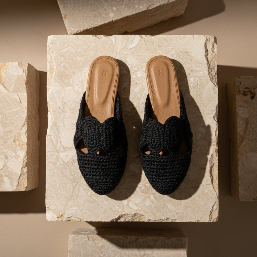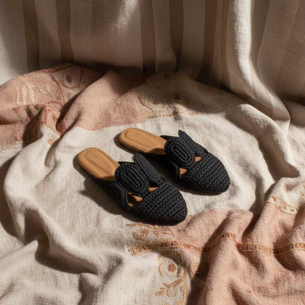 Balah handmade. Introducing a new hand technique . Manufactured in natural brown leather sole inside out , blackncolor threading in our classic style covered with crochet that takes up to 6 hours to complete one pair. Comfortable for your everyday wear from our Resort’20 collection.