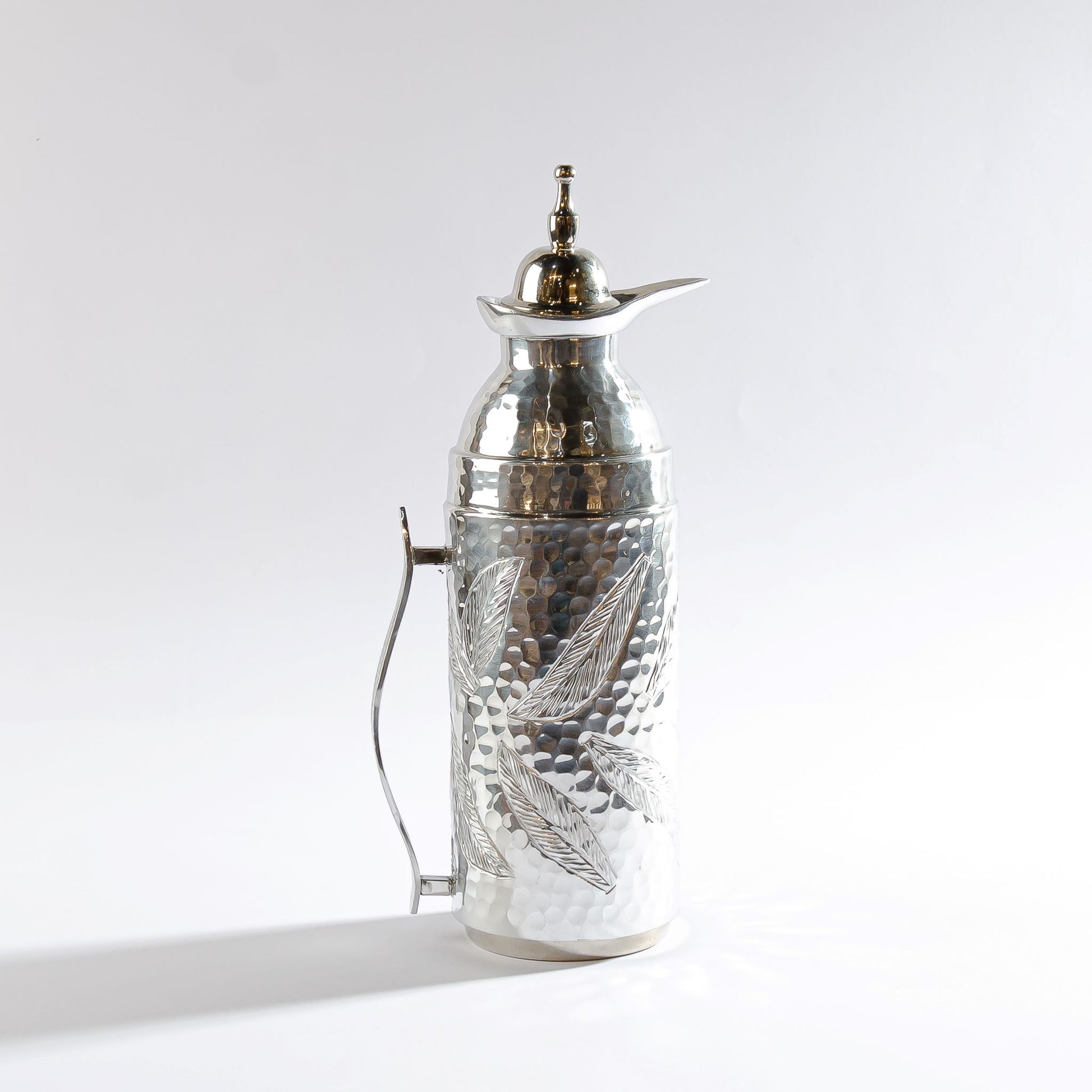 This flask is crafted from high-grade aluminium and finished with a refined silver chrome coating. The hammered texture and embossed leaf motifs reflect skilled craftsmanship, resulting in a piece that combines lasting thermal performance with timeless, elegant design.